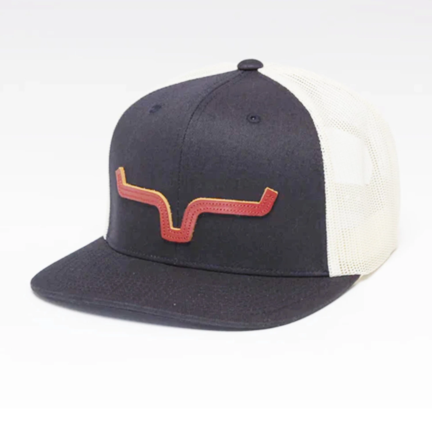 The ATG Kimes Ranch ATG Trucker cap comes with a high profile flat brim. The front panels are made of a cotton twill and the back panels are a poly mesh for ventilation.Â
