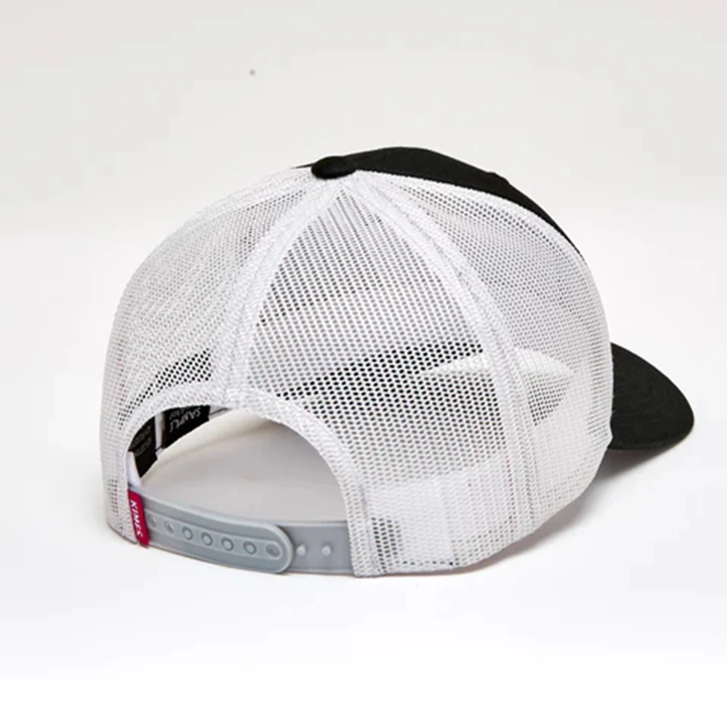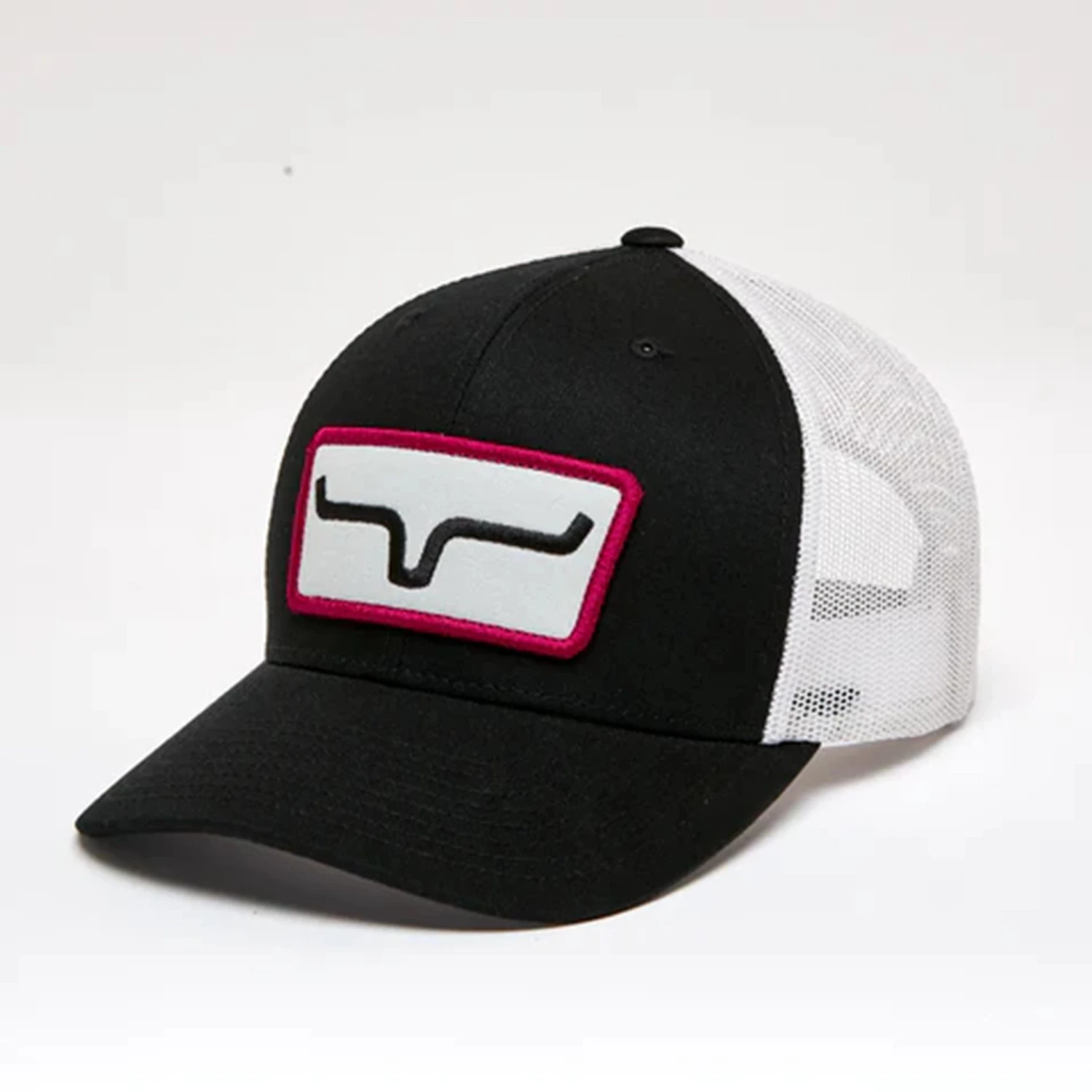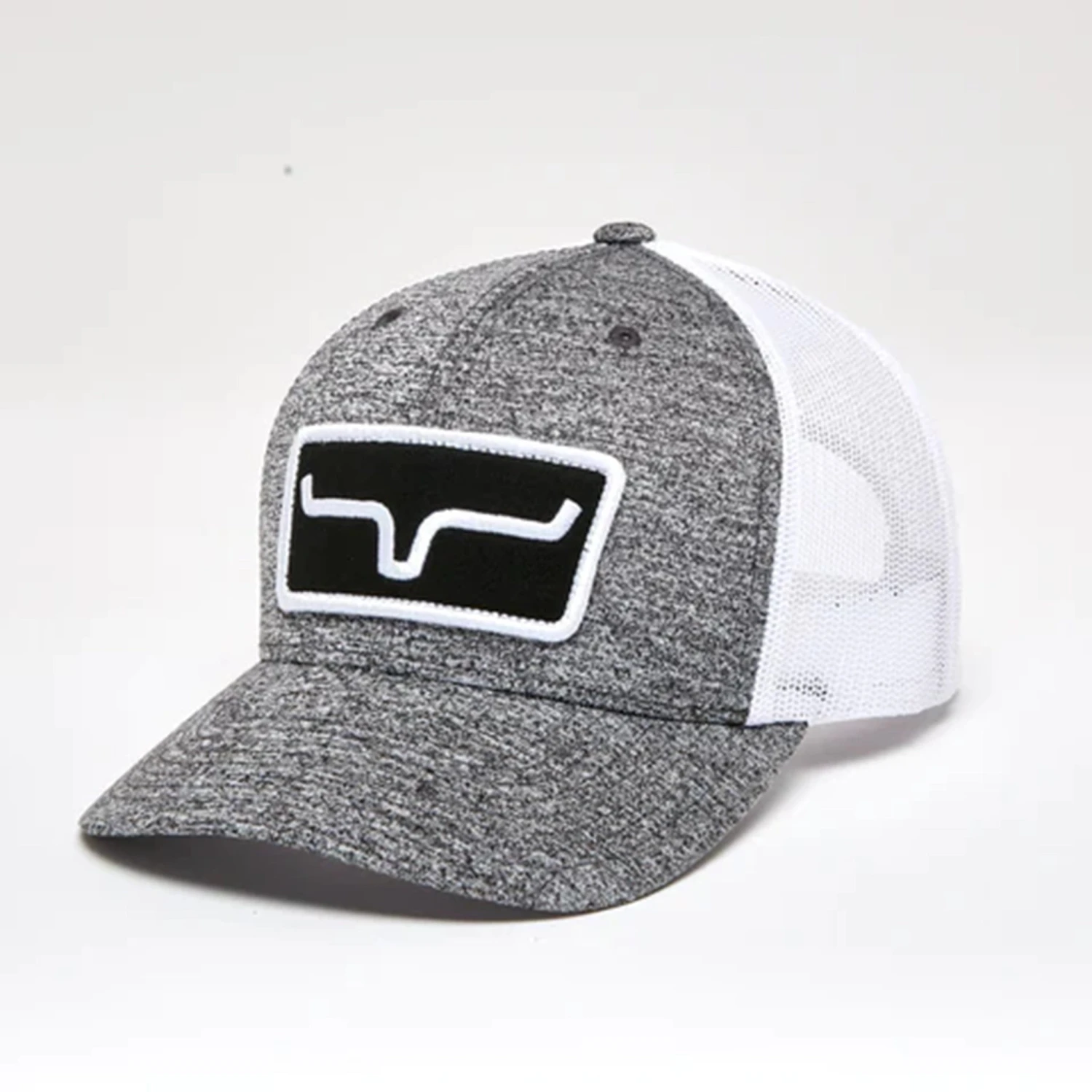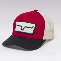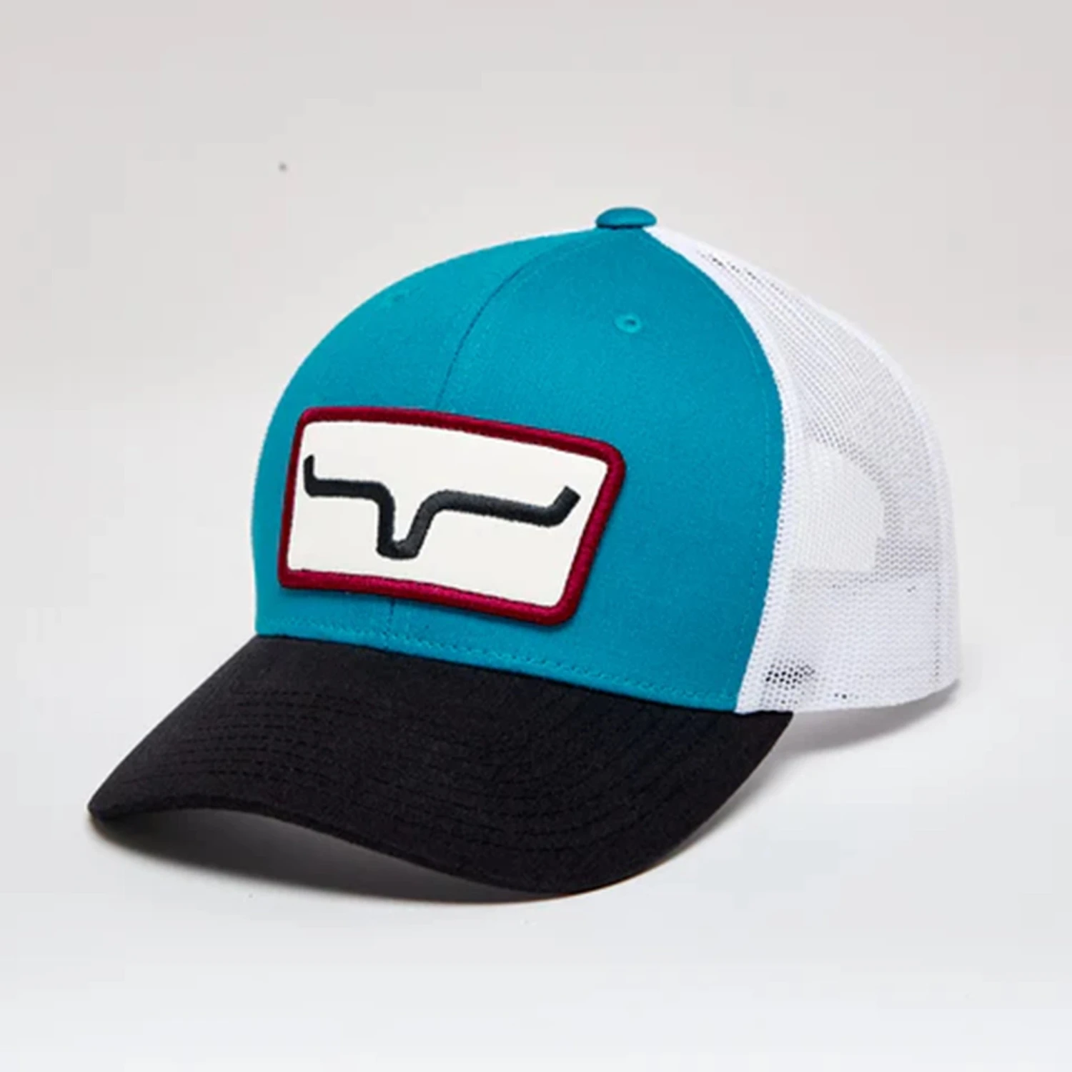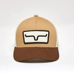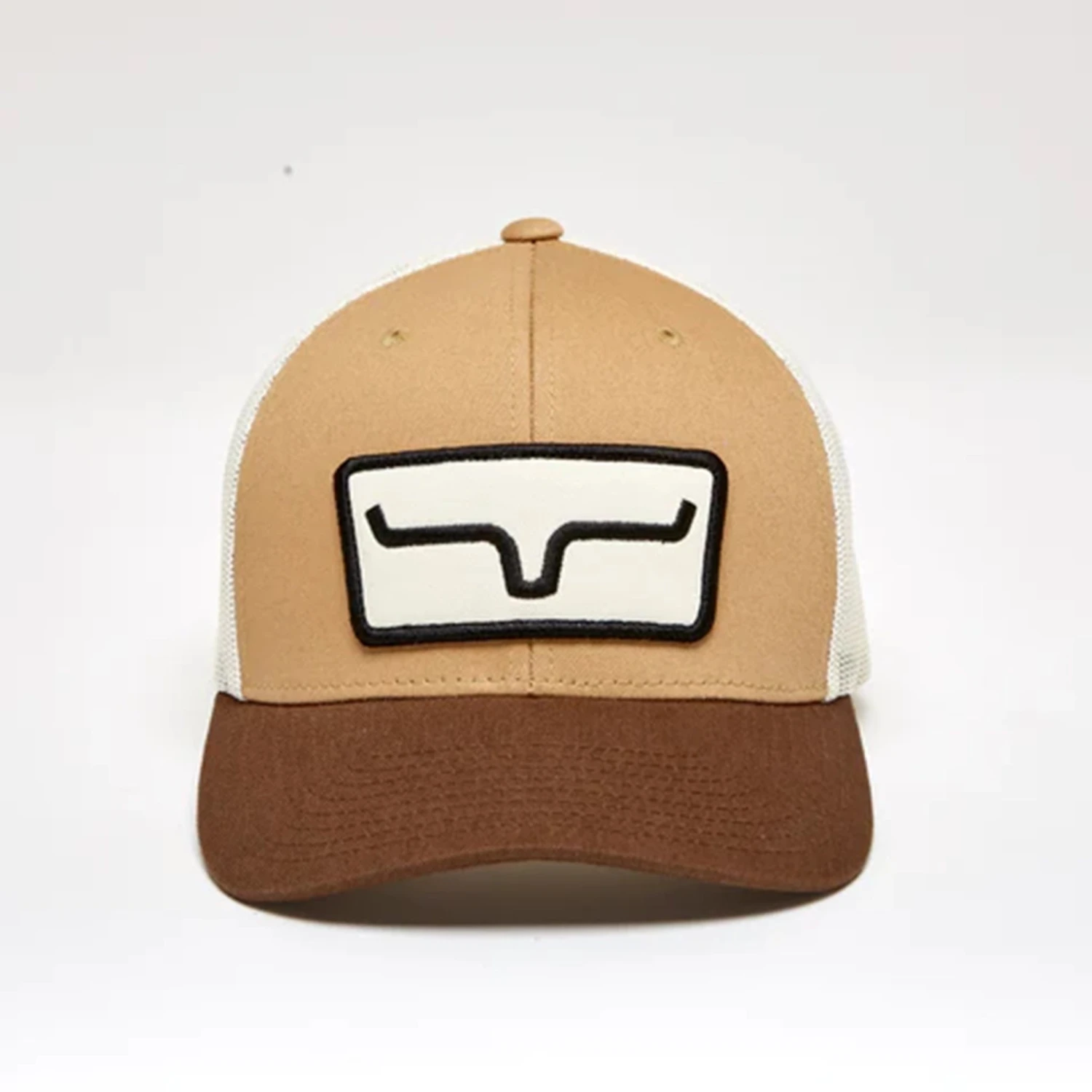 The Kimes Ranch Cutter is offered in a mid-profile slightly curved brim body with mesh back panels and an adjustable backstrap for fit. The Kimes Ranch Horns patch is front and center.