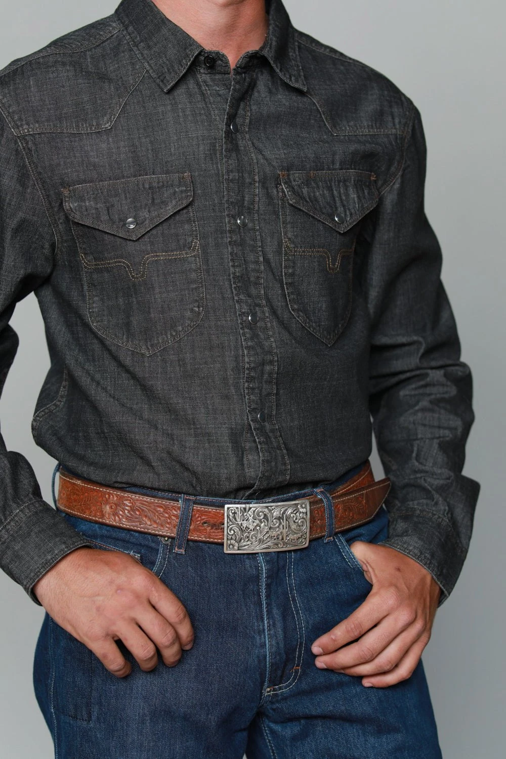 Popular among cowboys and cowgirls, Kimes Ranch’s product deliver durability and comfortableness for the trail, ranch or city. This particular item, made from 65% cotton/35% spandex material blend features a snap button front, moisture-wicking fabric, and horns stitching on chest pockets.