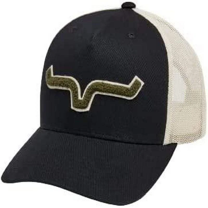 We love the look of this fresh new mid profile Kimes trucker cap, the ‘Tracker’ trucker featuring a black cotton twill front, mesh back, and unique textured green Felt/Chenille longhorn logo Patch.