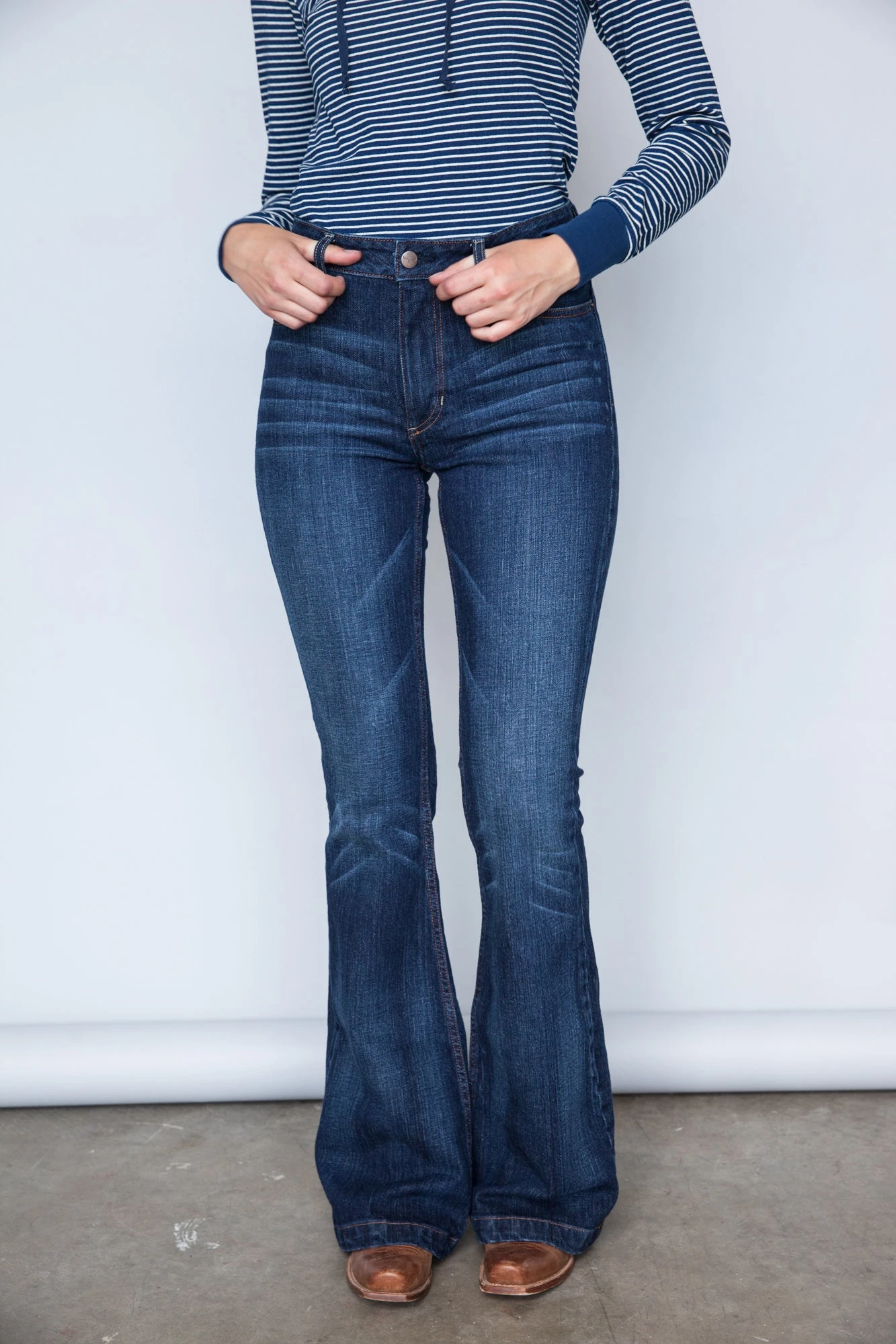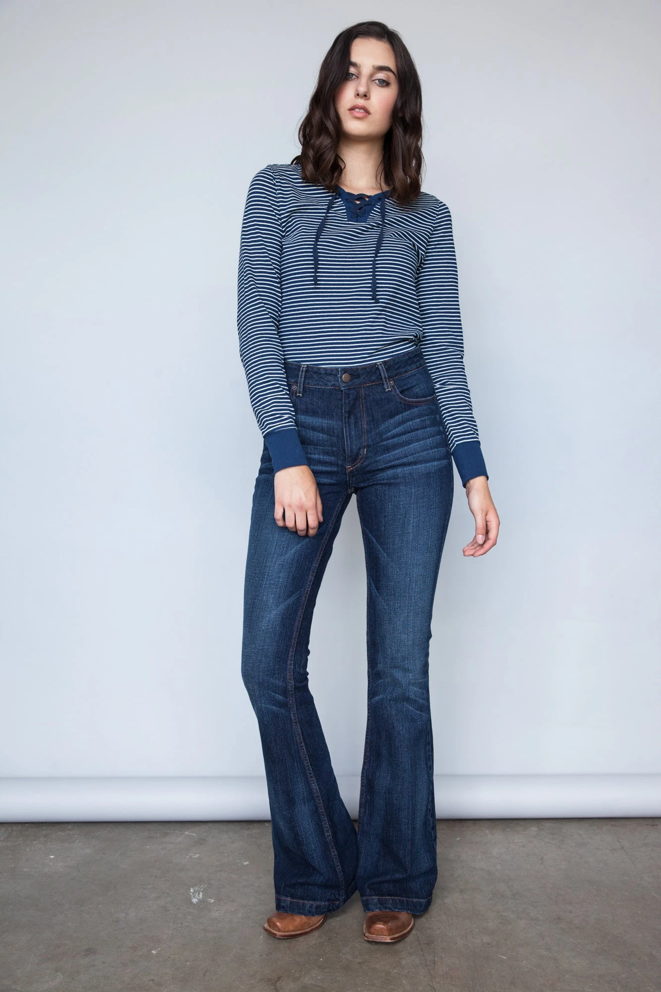 Popular among cowboys and cowgirls, Kimes Ranch’s product deliver durability and comfortableness for the trail, ranch or city. This particular item, made from 99% cotton/1% spandex , features a ultra high rise, super wide flare leg, and hand sanded.