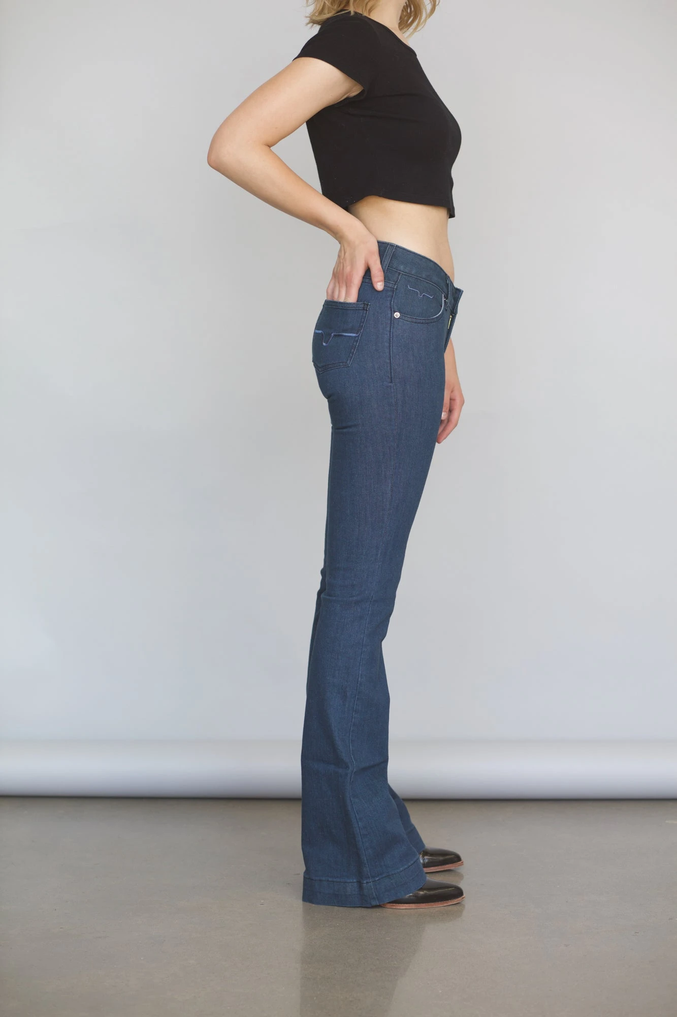 Popular among cowboys and cowgirls, Kimes Ranch’s product deliver durability and comfortableness for the trail, ranch or city. This particular item, made from 93% cotton/6% polyester/1% elastine , features a mid rise, trouser fit, and wide flare leg.